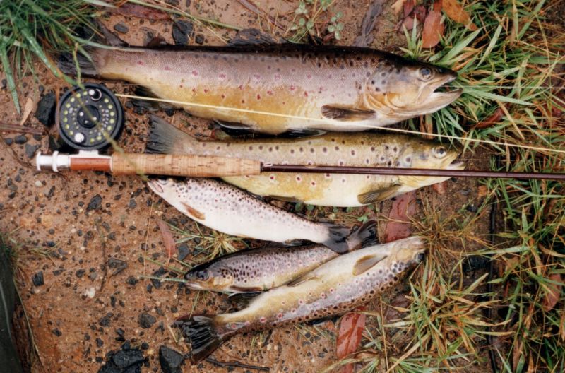 Pstragi zlapane po wylewie rzeki na lace.