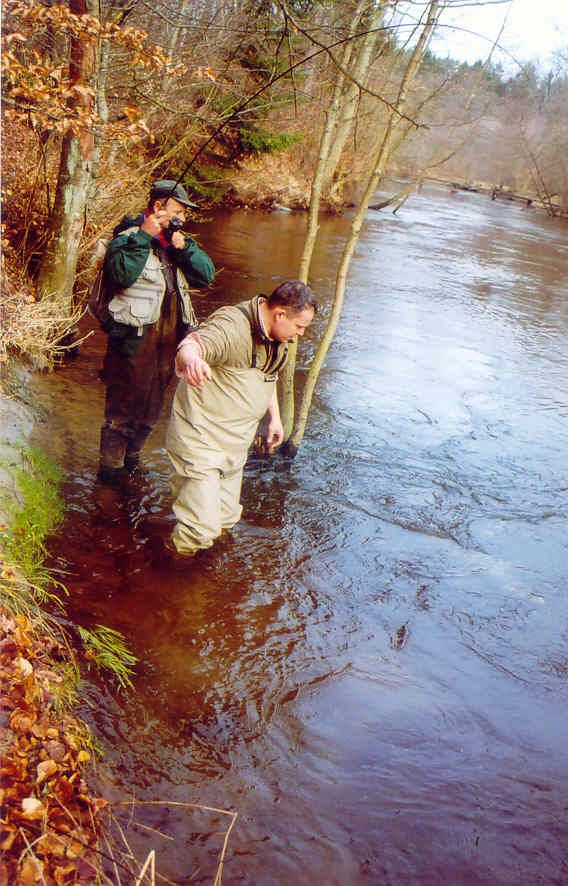 Hol łososia 91 cm. Rzeka Słupia. Holuje Tadeusz. Czai się Marek. 23.03.2004.